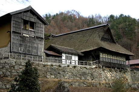 | 遠野の市街地から少し郊外にある綾織という地区に「千葉家」の大屋敷があります。 綾織は古く言い伝えに、六角牛山の女神の娘が蓮の糸で綾を織って領主に献上したという伝説が残る地で、そこにそびえ立つ豪壮な「千葉家」の屋敷は一気に伝承の世界へ引き込まれるような迫力を持っています。 岡山県の吹屋地域に見られるような、城壁を思わせる石垣をもった豪商・豪農建築で母屋・厩合わせて160坪といわれる南部曲家の頭領です。 天保元年(1830)農閑期の救済事業として10年の歳月を掛けて建てられたといい、小作人15人を含めた25人の家族と20匹の馬が同じ屋根の下で生活していました。 これだけの規模を誇る茅葺き屋根は、実に2トントラック60台分の茅と600人を越す職人によって20日間もの工期を要し、1000万円を超える費用がかかります。 現在国の重要文化財の指定に向けた調査が行われています。 |