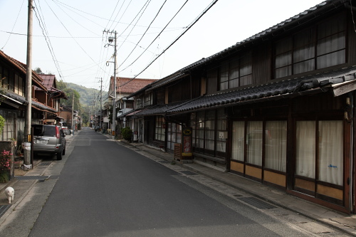 町の北端付近に建つ明治28年創業の青砥酒造、 「鉱泉旅館」の看板を掲げる常磐館、そして洋風建築の姿など、藩政期から明治・大正期に掛けて続いた長い繁栄の歴史を感じます。ひっそりと静まり帰った街路に響く用水の流れは、中国山地の山間の集落に多く見られる心地良い響きで旅人を迎えてくれます。