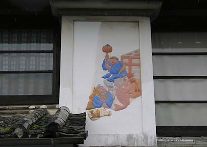 鏝絵とは、家や土蔵の壁などに描かれたレリーフで、漆喰の壁面に、鏝を使って浮き彫りを施し、彩色したものです 。鏝絵が施された民家は昭和以降のものですが、建て替えなどで年々数が減っていっているそうです。