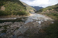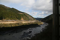 次の吉野生(よしのぶ)駅は列車交換が可能な2線の相対式ホームを持っていたが、その次ぎの真土(まつち)駅は列車一両分だけの小さな停留場。このあたりから本格的に四万十川の支流・吉野川の蛇行に沿って「川線」らしい車窓が始まっていく。そして次の西ヶ方駅との中間で県境を越えて高知県へと入る。 江川崎駅は2面4線のホームのほかに留置線もある大きな駅。駅舎もあるが無人で、周囲には民家が数軒あるだけである。この駅は西土佐町(現在は中村市と合併して四万十市)の玄関口であるが、町は駅から離れていて生活の足にはなりそうに無い。この駅はかつて貨物輸送も行われていたが、予土線が全通する以前の宇和島線の終着駅だったのだ。この江川崎駅の先でここまでいっしょだった吉野川がこの先で四万十川に合流する。 土佐くろしお鉄道中村・宿毛方面との分岐である、川奥信号場で一時停止。信号を確認してから発車。土佐くろしお鉄道はここからトンネルループで谷を下っていく。はるか眼下にその先の線路が見えて高低差を実感できる。 |